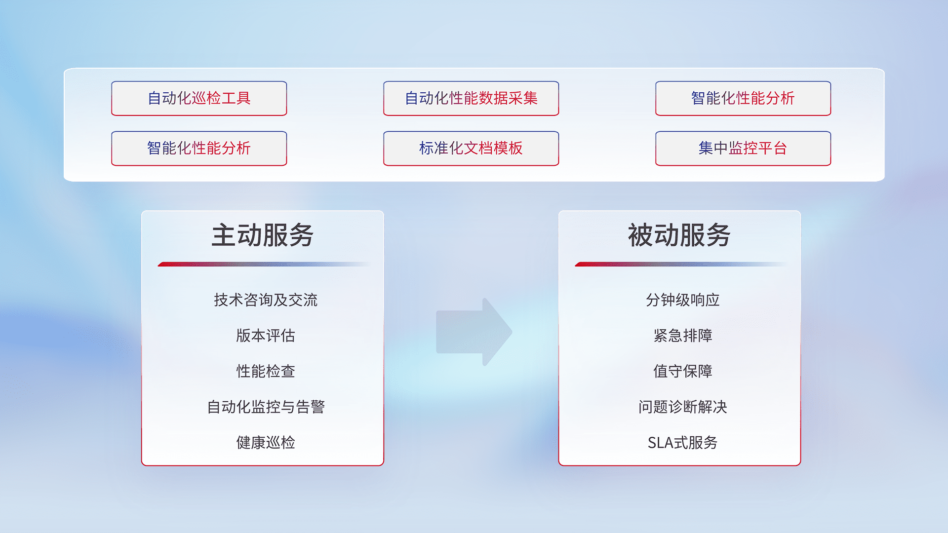 智能化工具和标准化文档,,,保障服务质量,,提供主动服务(包含技术咨询、、、、版本评估、、、性能检查、、、、自动化监控与告警、、、、健康巡检)和被动服务包含(分钟级响应、、紧急排障、、值守保障、、问题诊断解决、、SLA服务)。。。